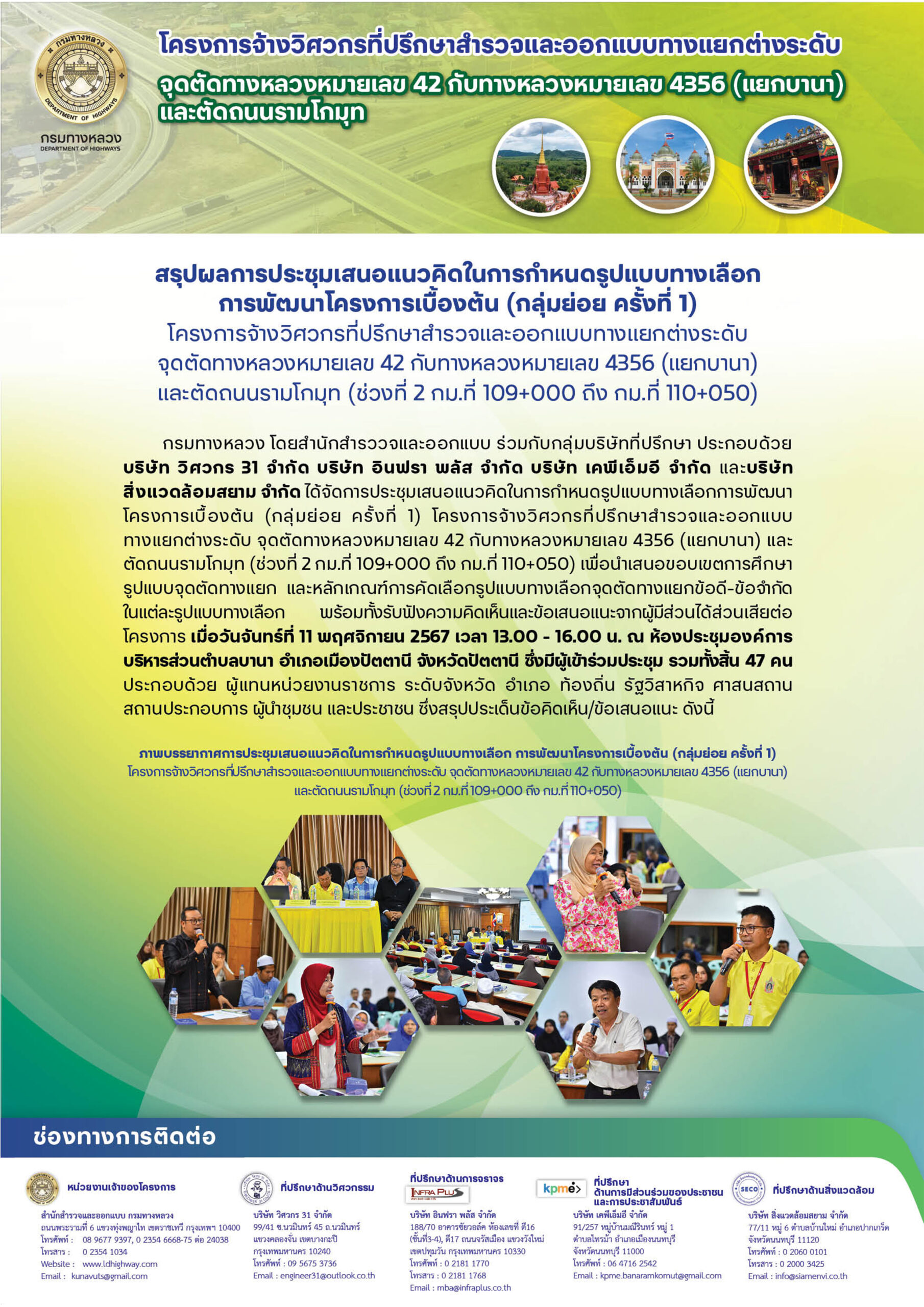 กรมทางหลวงได้จัดทำแผนพัฒนาทางหลวง โดยกำหนดตามทิศทางของการพัฒนาระบบคมนาคมและขนส่งของแผนพัฒนาเศรษฐกิจและสังคมแห่งชาติแต่ละฉบับมาตามลำดับ งานที่ดำเนินการจะครอบคลุมถึงโครงการใหม่ซึ่งเป็นงบลงทุนก่อสร้างและบูรณะทางหลวงทั่วประเทศ อาทิ งานก่อสร้างทางหลวงพิเศษระหว่างเมืองงานก่อสร้างเพิ่มมาตรฐานทางหลวงให้เป็น 4 ซ่องจราจรหรือมากกว่า งานบูรณะและปรับปรุงทางลาดยางเดิมงานก่อสร้างเป็นทางลาดยางมาตรฐาน งานก่อสร้างทางแนวใหม่ งานก่อสร้างทางแยกต่างระดับและสะพานลอยตลอดจนงานอำนวยความปลอดภัย เป็นภารกิจหลักที่กรมทางหลวงมุ่งที่จะพัฒนาให้สมบูรณ์ ในการดำเนินการให้เป็นไปตามแผนงานดังกล่าว กรมทางหลวงจะต้องจัดเตรียมโครงการให้เป็นไปตามแผนงาน โดยเฉพาะงานสำรวจและออกแบบ ซึ่งในปีงบประมาณนี้มีโครงการก่อสร้างเพิ่มมากขึ้น เพื่อให้การเตรียมโครงการเป็นไปตามแผนงานและเพื่อเป็นการส่งเสริมกิจการของที่ปรึกษาไทย ตามนโยบายรัฐบาล กรมทางหลวงจึงแบ่งงานส่วนหนึ่ง เพื่อว่าจ้างบริษัทวิศวกรที่ปรึกษาช่วยในการสำรวจและออกแบบ ซึ่งจะช่วยให้งานสำรวจและออกแบบเป็นไปตามแผนทันกับงานโครงการก่อสร้างและงานจัดกรรมสิทธิ์ที่ดินที่จะดำเนินการได้เมื่อมีแบบแล้ว